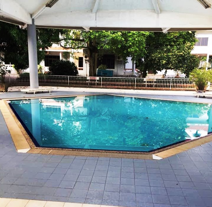 Khu vực bể bơi với không gian mở thoáng đãng, sạch sẽ được lắp đặt hệ thống mái che hiện đại