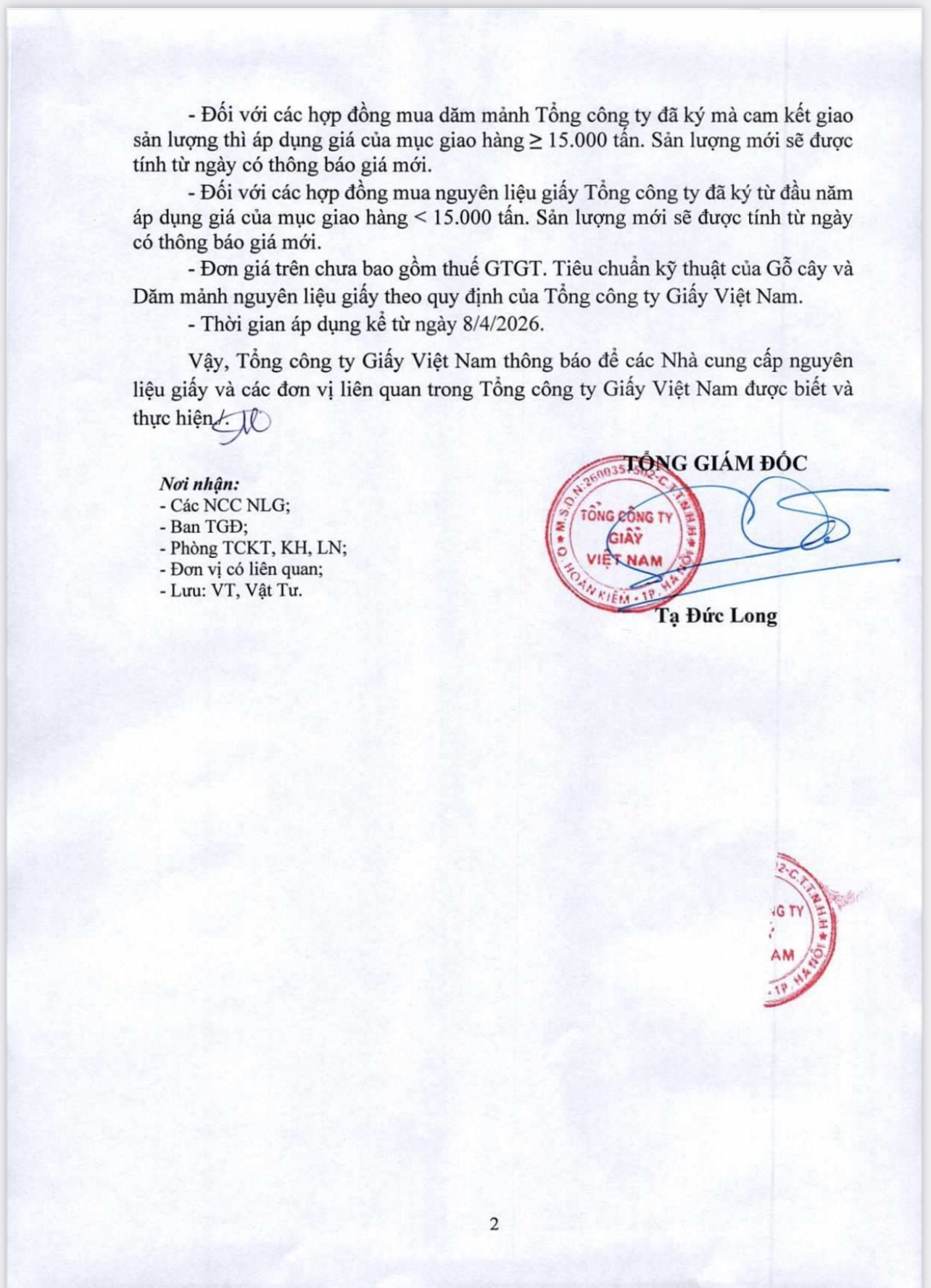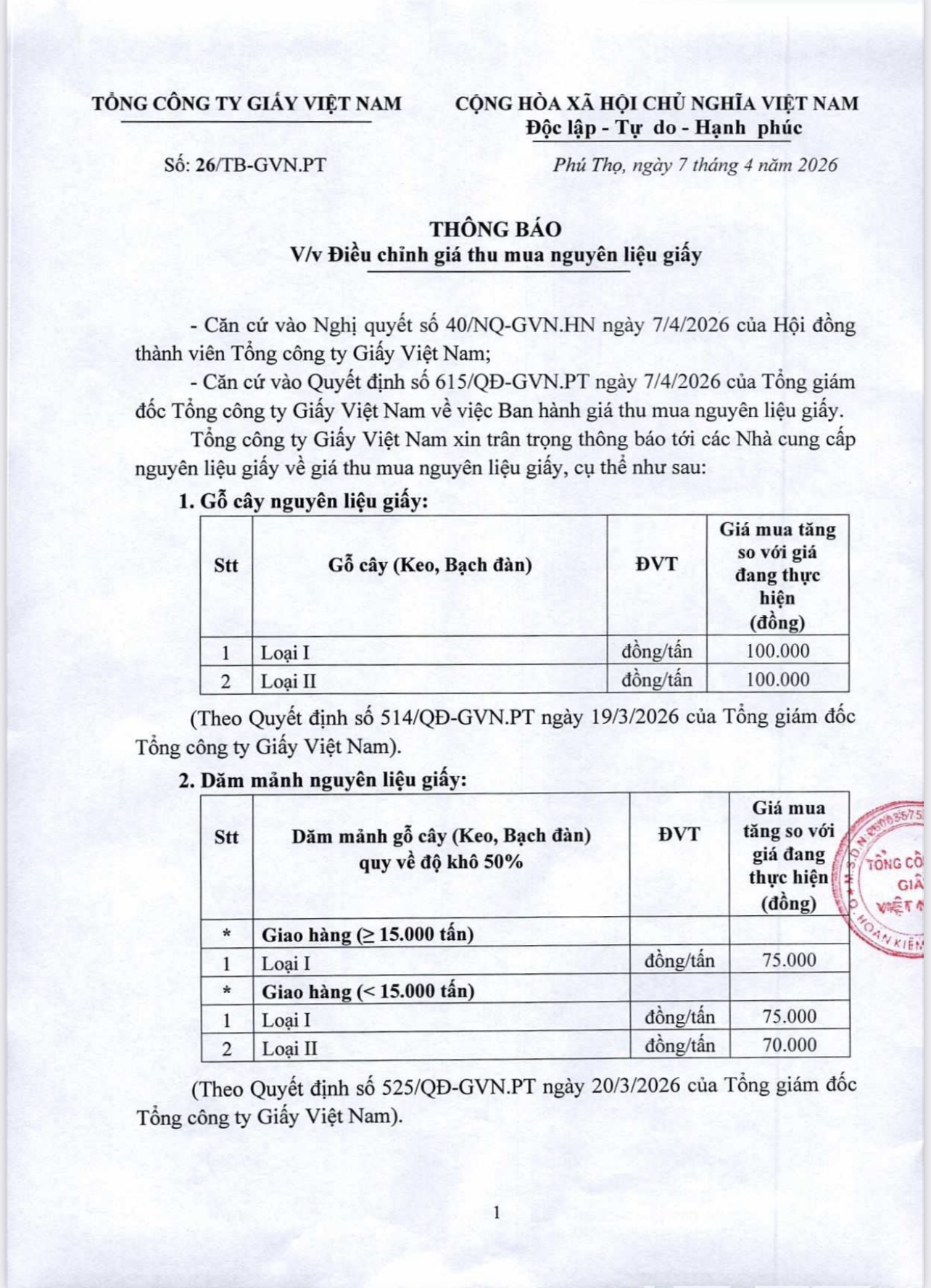 Thông báo về việc điều chỉnh giá thu mua nguyên liệu giấy